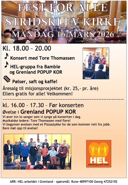 HEL arbeidet i Grenland inviterer til FEST FOR ALLE mandag 16.mars kl 19-20 i Stridsklev kirke.